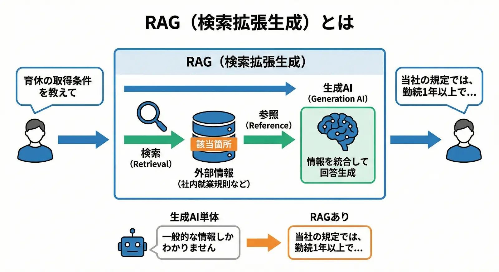 生成AI単体で回答を完結させるのではなく、「必要な情報を探す工程」を間に挟むことで、回答の正確性や実用性を高めます。たとえば、社員が「育休の取得条件を教えて」と質問した場合、RAGは社内の就業規則から該当箇所を検索し、その内容をもとに回答を生成します。